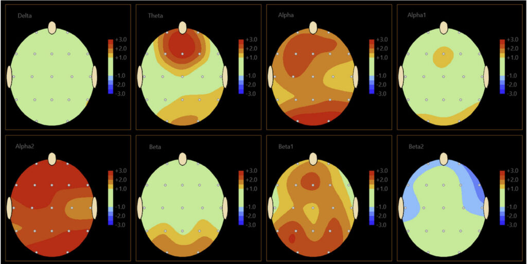 qEEG Brain Map (Quantitative EEG): is a non-invasive, process that records brain’s natural activity patterns, providing insight into how different regions are communicating and functioning.